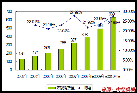 从我国银行电子支付密码器系统的表观消费量来看,近几年来增长速度很快。2003年我国银行电子支付密码器系统的表观消费量为139万台,2004年增加到171万台,比上年增长了23.01%,2005年表观消费为208万台,2006、2007年分别为255、327万台。在受到2008年全球经济危机的影响,预计2008年表观消费量为398万台,增幅下降到21.92%,其主要原因是金融危机的影响使得市场需求、企业产量都受到了很大的影响。而未来几年银行电子支付密码器系统表观消费依然保持较快的增长速度,预计到2010年我国银行电子支付密码器系统的表观消费量为630万台。