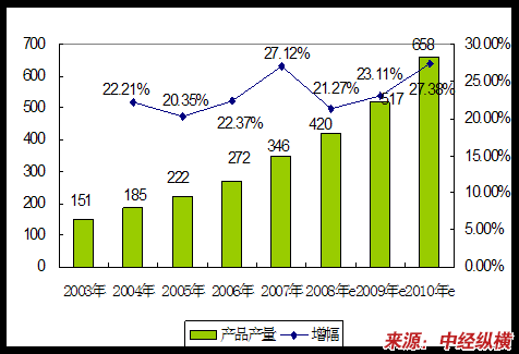 我国银行电子支付密码器系统的发展速度较快,2003年全国 行业 产量为151万台,到2004年产量增加到185万台,比上年增长了22.21%,2005年产量222万台,2006、2007年产量增幅分别为22.37%、27.12%,到2007年底,全国银行电子支付密码器系统产量达到346万台。预计在未来 行业 需求增加,企业规模及产能扩大的情况下,我国银行电子支付密码器系统的产量依然保持较快的增速,但受到2008年全球金融危机的影响,银行电子支付密码器系统的增速将有所下降。预计2008年在全球金融危机的影响下,全年产量预计为420万台,而2009年下半年 行业 将逐渐恢复生产增长,预计到2010年全年产量将达到658万台,未来几年产量增幅将在20%以上。