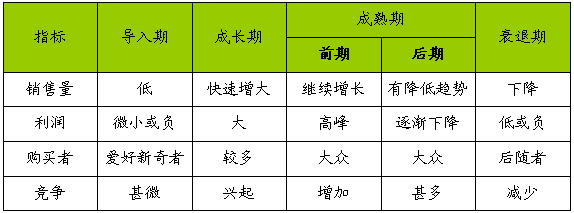 产品生命周期:产品在完成研制以后,从投入市场开始到被市场淘汰为止所经历的时间。在产品生命周期的不同阶段中,销售量、利润、购买者、市场竞争等都有不同的特征,这些特征可用下概括。