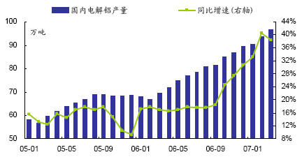 2007年,中国铝工业投资增长较快,产能迅速膨胀,由于新增产能的大量释放,2007年铝产量强劲增长。