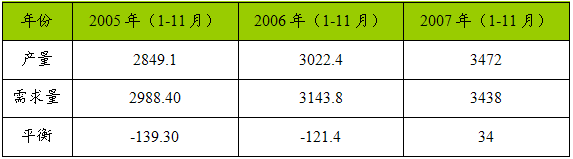 根据以上对我国电解铝产量和表观消费量的 分析 ,预计2007年产量将达到1240万吨,表观消费量将达到1220万吨,因此可以得出,2007年我国铝依然处于供过于求的局面,这一结果在我国铝库存的增长上也逐步体现出来。