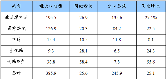 2007年,我国医药保健品对外贸易再创历史新高,达到385.9亿美元,同比增加25.6%。其中,出口245.9亿美元,同比增加25.1%,与全国整体出口增速相当;进口140亿美元,同比增长26.6%;全年医药对外贸易顺差达105.9亿美元,但医药保健品进口增幅高于出口增幅1.5个百分点。