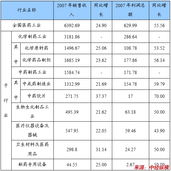 从 行业 分组来看,医药工业的化学原料药 行业 、化学药品制剂 行业 、中成药 行业 三大支柱 行业 累计实现销售收入的增长幅度分别为17.22个百分点、10.42个百分点和14.00个百分点。其中,化学原料药 行业 实现销售收入1496.67亿元,同比增长25.06%,利润总额108.78亿元,同比增长53.52%;化学药品制剂 行业 实现销售收入1685.19亿元,同比增长23.62%,利润总额177.86亿元,同比增长56.14%;中成药 行业 实现销售收入1312.99亿元,同比增长21.69%,利润总额154.78亿元,同比增长59.79%;中药饮片 行业 实现销售收入271.75亿元,同比增长高达37.37%,利润总额17亿元,同比增长为70.00%;生物制剂 行业 实现495.39亿元,同比增长21.62%,利润总额63.18亿元,同比增长50.00%;医疗器械 行业 实现销售收入547.95亿元,同比增长22.05%,利润总额59.46亿元,同比增长43.90%;卫生材料 行业 实现销售收入298.8亿元,同比增长31.14%,利润总额24.27亿元,同期增长50.00%;制药机械 行业 实现销售收入44.55亿元,同比增长25.00%,利润总额2.67亿元,同比增长50.00%。
