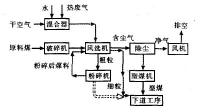 经用煤发尘装置对运输过程中装入煤的水分减少和发尘量的关系进行了试验的结果,含水9%的常规装炉煤的发尘量为0.5g/cm3,当预干燥至含水5%~6%时为0.8g/cm3,当进一步脱水至2%时则上升至2g/cm3。另用显微镜观察的结果,当煤中含水高时,煤的微粉以水为综合剂多附在煤的粗粒上致发尘量低,但经预干燥脱水后,煤的微粉则分散化致发尘量上升。经试验,当煤中小于74μm的微粉比由5%上升到15%时,发尘量则由40mg加大至100mg。为降低预于燥煤的发尘量,采取了对微粉煤预成型(DAPS)的技术进行处理。