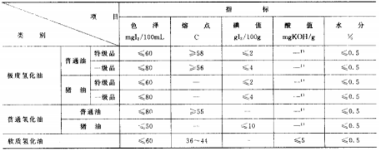 (1)极度氢化油,适用于硬脂酸生产等。依油源分为普通油极度氢化油和猪油极度氢化油,各分为特级品和一级品。