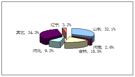目前我国淀粉生产加工 行业 分布主要以山东、吉林、河北等地为主,根据各地区淀粉生产企业数量及规模 分析 ,重力曲筛潜在消费地区分布如图所示,其中,山东、吉林重力曲筛潜在消费量占比总消费量分布为32.1%、18.5%。