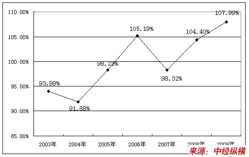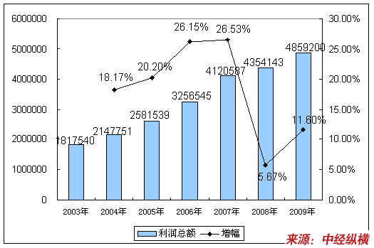 从利润总额来看,近几年 行业 利润总额整体上涨较快,2003~2009年涨幅为167.35%,年平均增长27.89%。
