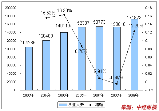 行业 从业人员从2003年的10.43万人增至2009年的17.18万人,增幅为64.76%,年平均增长速度为10.79%,快于企业数量增长。2004、2005年从业人数增幅分别为15.53%、16.30%,自2006年起 行业 从业人数增速逐渐下降,2008年受金融危机影响,多数企业减产裁员, 行业 从业人数较2007年减少了0.49%,2009年经济的逐渐好转使得 行业 就业机会增多,从业人数继续快速增长。
