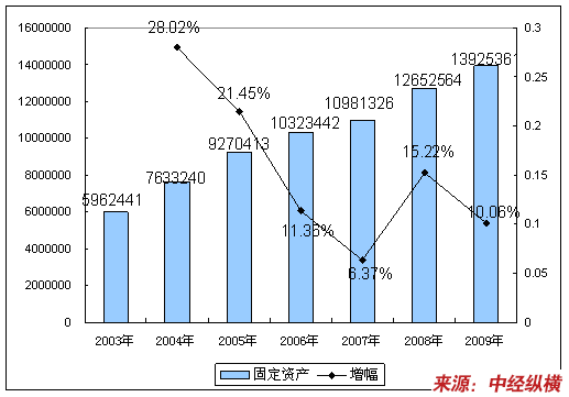 行业 固定资产近几年增长较快,2003~2009年固定资产增幅为133.55%,年平均增速为22.26%,目前 行业 固定资产已经达到139亿元。但是从固定资产增长情况来看,2006年以来固定资产增长明显放缓。