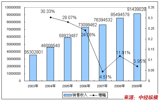 2003~2009年 行业 销售收入增长了159.01%, 行业 销售收入达到914亿元。2004~2006年 行业 销售收入增长水平均超过20%,2007年以来销售收入增长速度下降。