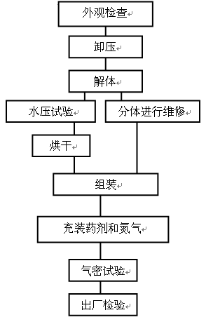 灭火器前处理喷丸生产线工艺流程:上件→工件定位→工件自转→外壁喷丸→内壁喷丸→内外壁吹灰→下件。