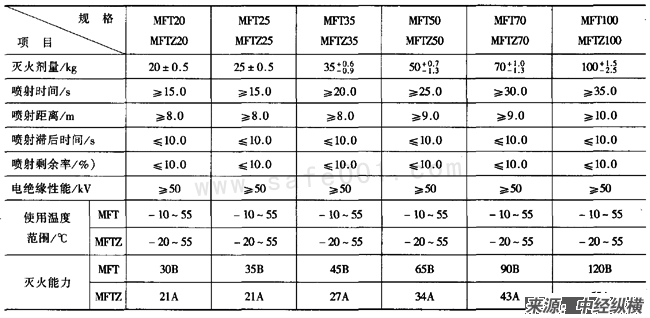 MFT推车式干粉灭火器按干粉灭火剂充装量分有20、25、35、50、70、100kg 6种;按加压气体储气方式分有储气瓶式和储压式两种;按干粉灭火药剂种类分有碳酸氢钠干粉灭火器和磷酸铵盐干粉灭火器。