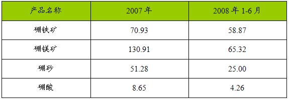 2007—2008年6月硼铁矿及相关硼矿产品产量表