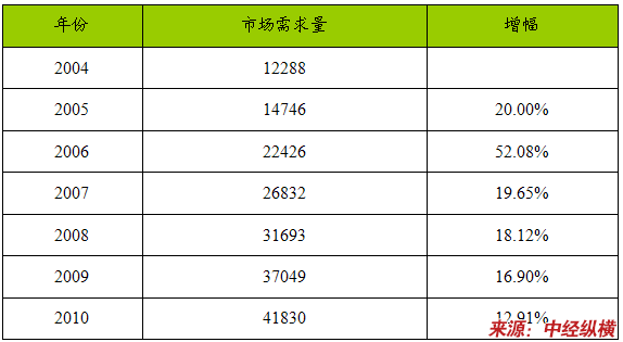 2004—2010年无水氯化镁市场需求量 分析 及预测表