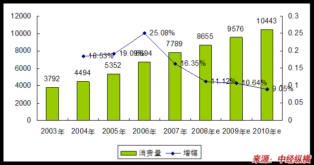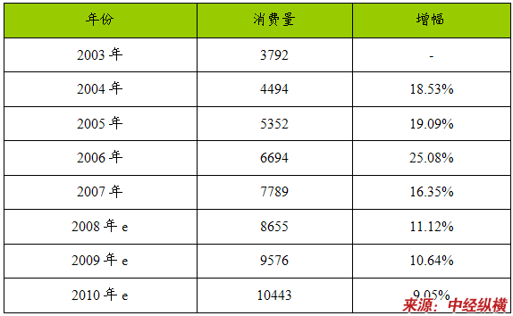2003-2010年八氟戊醇(OFP)产品消费量 分析 及预测表