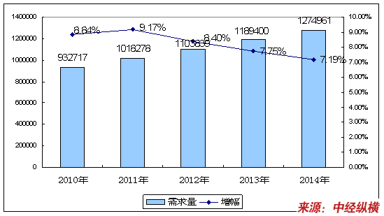 2010-2014年我国铝合金线产业规模及增幅预测表