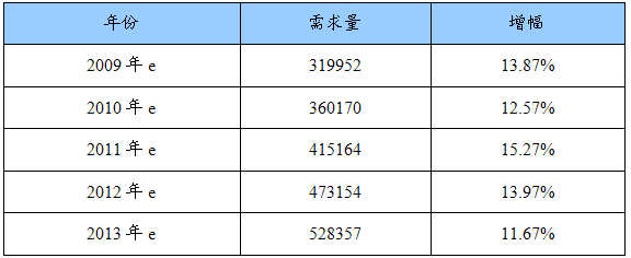 2009-2013年我国氯化胆碱产品需求量及增幅预测表