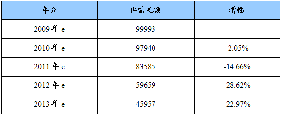2009-2013年我国氯化胆碱产品供需差额及增幅预测表