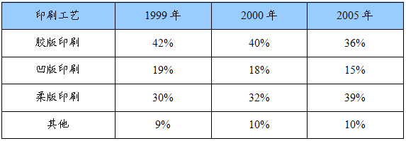 在美国的四大印刷工艺中,胶印、凹印和凸印的市场比重均呈下降趋势,凹印从30%的市场比重下降到2005年的15%左右,只有柔版印刷工艺的市场份额呈现增长趋势。美国各类印刷工艺的市场份额占比情况如下表所示: