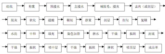组批—称重—预浸水—主浸水—碱脱毛或酶脱毛、 浸灰—去肉—脱灰—软化—浸酸—鞣制—静置—剖层—削匀—复鞣—水洗—中和—填充—染色加脂—挤水—干燥—振软—补伤—封底—干燥—振软—喷中层—真空干燥—振软—摔软—喷顶层—成品革