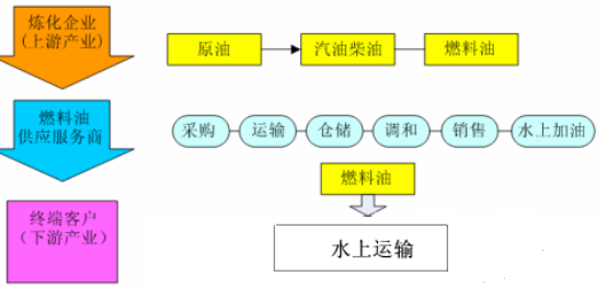 我国燃料油产业链由生产、供应服务和终端用户组成。供应服务企业的主要业务活动包括采购、运输、仓储调和、销售及船舶水上加油等。