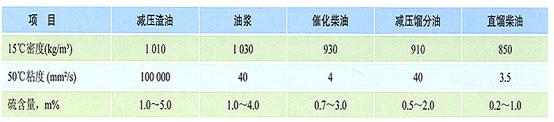 船舶残渣型380#燃料油通常由减粘渣油、催化裂化重循环油(HCO)、催化柴油三种组分调合生产。50℃粘度低于380mm2/s的残渣型船舶燃料油,通过调入适当比例的柴油馏分来生产。船舶燃料油的主要调合组分性质如表。