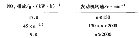 MARPOL附则Ⅵ对NOx排放的规定为:2000年1月1日以后建成(或经重大改造)的、功率大于130kW的不同转速船用柴油机的具体排放控制标准如下表所示。