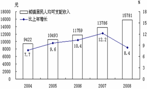 2004-2008年城镇居民人均可支配收入及其增长速度
