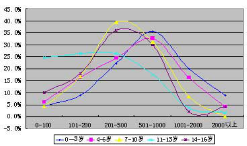 儿童这一群体虽然属于零收入阶层,但消费能力却不容小觑。目前我国16岁以下儿童有3.6亿左右,占人口的比重约20%。据北京艾索咨询与现代教育报启蒙专刊联合调查,我国儿童消费已占到家庭总支出的30%左右,2007年初全国0-12岁的孩子每月消费总额超过35亿元。我国大城市儿童月消费有17.7%在100至200元、29.7%在200至500元、有28.9%在500至1000元。这一群体可谓是高消费群体。儿童市场可谓是一块诱人的大蛋糕。