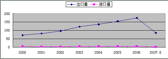 从统计上看,我国的塑料软包装处于净出口状态,产品出口量远高于产品的进口量。产品的出口量增长较快,从2000年的71.2万吨,增长到2006年的174.6万吨,出口量增长较快。而产品进口方面,2000年产品进口量较大为4.13万吨左右,2001年的产品进口量下降,随后产品进口量呈上升的趋势,2006年进口量达到4.31万吨左右。