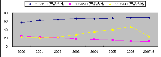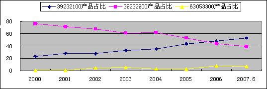 从我国塑料软包装出口情况来看,乙烯聚合物(39232100)产品出口量最大,2006年达到119.8万吨,占塑料软包装 行业 的68.61%。而且其出口量占比从2000~2006年呈现上升的趋势。其他塑料包装(39232900)的产品占比较小,而且呈现下降的趋势,从2000年的25.14%下降到2006年的22.3%。其他聚乙烯、聚丙烯包装(63053300)产品出口比重也呈现上升的趋势,但是出口量小于乙烯聚合物产品的出口量。