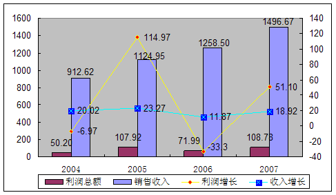 从销售收入来看,销售收入总量一直呈不断增长态势,2007年原料药的收入达1496.67亿元,这也反映了该子 行业 的需求总量的不断增加。从增长速度来看,除2006年有较大幅度下降外,其余各年均在均在20%左右。2007年的收入增速已基本回复到2006年以前水平。
