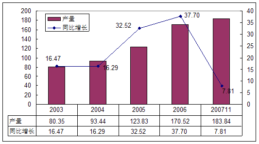 从化学原料药的生产来看,2003年的产量为80.35万吨,2004年为93.44万吨,2005年突破100万吨大关,达到123.83万吨,2007年产量至183.84万吨,呈不断增长态势。