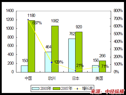 2005、2007年全球太阳能电池板主要生产地区和国家产量及产量增长率