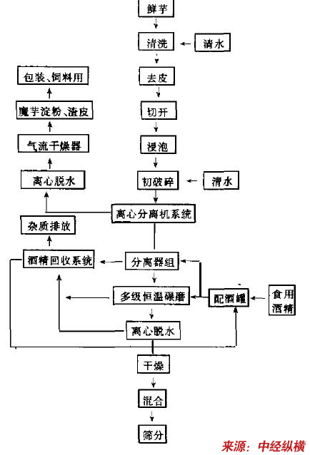湿法则直接从鲜魔芋球茎开始,其工序为:鲜魔芋-水洗-除去芽和根-表面干燥-在酒精介质中破块擂碎-在酒精介质中进-步粉碎到-定的粒度-过滤、甩干-烘干-筛选、分级-检验-包装-成品。湿法适合大型酒精厂开发生产魔芋精粉,适用于鲜魔芋直接生产粒度更小的魔芋微粉。