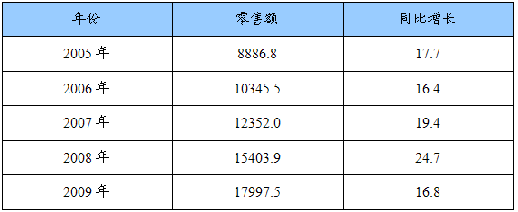 2005-2009年我国住宿和餐饮业零售额增长情况