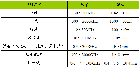 微波是电磁波频谱中无线电波的一个分支,它是频率很高且波长很短的一个无线电波段,通常它是指频率范围在300MHz~3000GHz之间或波长范围在1m~0.1mm之间的无线电波。在微波波段中,通常又再划分为分米波、厘米波、毫米波和亚毫米波,其中厘米波是目前发展最成熟和应用最广的波段,所以它常被称为微波的典型。亚毫米波又称为超微波或远红外波,由于它目前尚未得到很好的开发,因此,对于是否把它归入微波范围以及它所包括的波长下限都暂时没有统一的意见。