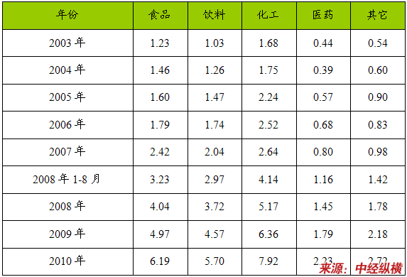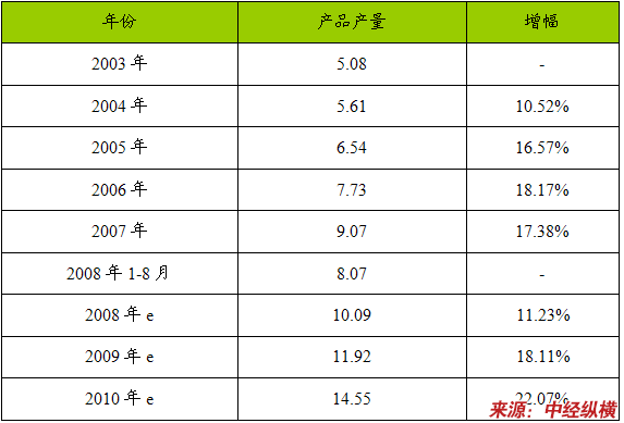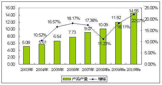 我国塑料标签的发展速度较快,年产量增幅在10%以上,2003年全国 行业 产量为5.08亿平方米,到2004年产量增加到5.61亿平方米,比上年增长了10.52%,2005年产量突破6.54亿平方米,2006、2007年产量增幅均超过18%,到2007年底,全国塑料标签产量达到9.07亿平方米。预计在未来 行业 需求增加,企业规模及产能扩大的情况下,我国塑料标签的产量依然保持较快的增速,但由于2008年全球金融危机的影响,2008年产量增速将放缓,全年产量预计为10.09亿平方米,而2009年下半年 行业 将逐渐恢复生产增长,预计到2010年全年产量将达到14.55亿平方米。