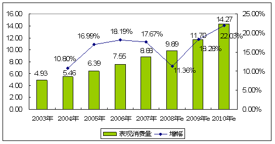 从我国塑料标签的表观消费量来看,近几年来一直以10%以上的速率增长。2003年我国塑料标签的表观消费量为4.93亿平方米,2004年增加到5.46亿平方米,比上年增长了10.80%,2005年表观消费为6.39亿平方米,2006、2007年分别为7.55、8.88亿平方米。预计2008年表观消费量为9.89亿平方米,增幅下降到11.36%,其主要原因是金融危机的影响使得市场需求、企业产量都受到了很大的影响。预计到2010年我国塑料标签的表观消费量为14.27亿平方米。