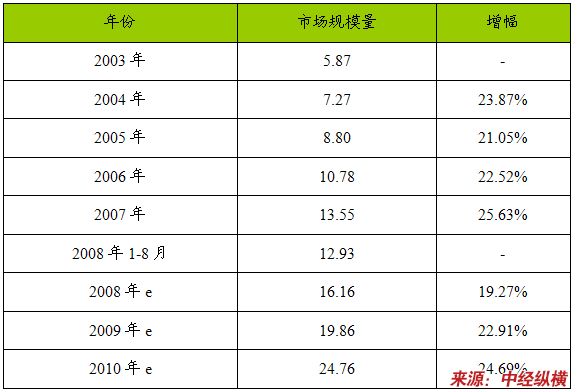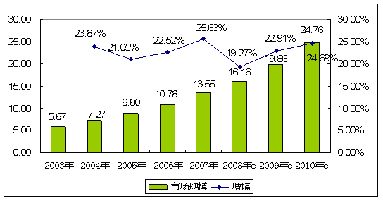 近几年我国塑料标签的市场规模量及增长率发展较快,2003年我国塑料标签的市场规模为5.87亿平方米,2004年市场规模量为7.27亿平方米,比上年增长了23.87%,2006年我国塑料标签的市场规模增长速度为22.52%,2007年市场规模增加到13.55亿平方米。受金融危机的影响,2008年下半年市场规模增速出现下滑,全年市场规模增速下降到19.27%,而预计2009年、2010年随着我国下游市场对塑料标签的进一步需求增加,市场规模将逐渐恢复,到2010年市场规模达到24.76亿平方米。