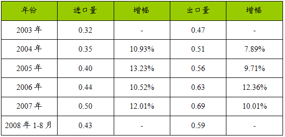 2003年我国塑料标签的进口量为0.32亿平方米,出口量为0.47亿平方米,2004年进口量为0.35亿平方米,出口量为0.51亿平方米,同比分别增长了10.93%、7.89%。2006年进口量增幅为10.52%、出口量增幅为12.36%,到2007年进出口量分别为0.50、0.69亿平方米,比上年分别上涨12.01%、10.01%。