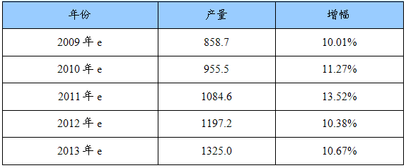 2009-2013年我国聚丙烯产量及增幅统计表