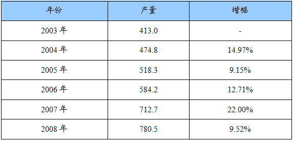 2003-2008年我国聚丙烯产量及增幅统计表