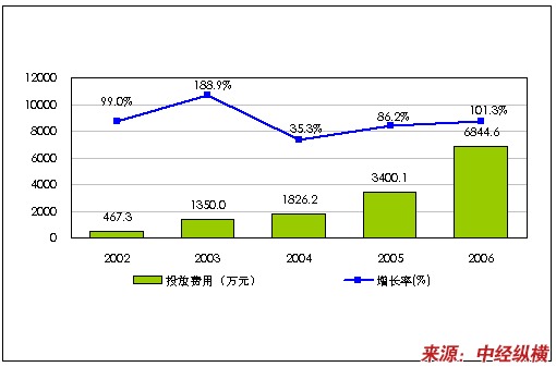 从2002年开始中国体育用品类网络广告投放费用一直保持高速增长趋势,年平均增长率达到101%,其中2006年网络广告投放费用达到6844.6万元,是2002的14倍。