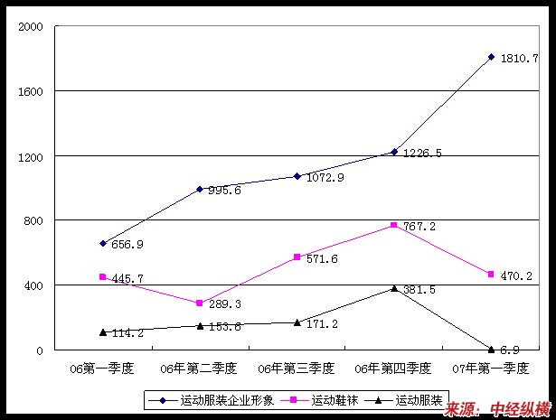 2006年四个季度中企业形象、运动鞋袜、运动服装三者的网络广告投放费用持续走高,尤其是企业形象的网络广告投放费用与后两者差距十分明显,处于远远领先的地位;2007年第一季度运动鞋袜和运动服装网络广告投入相继下降的同时,广告主对企业形象的营销非但没有下降,反而以较快速度持续增长。