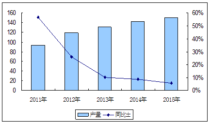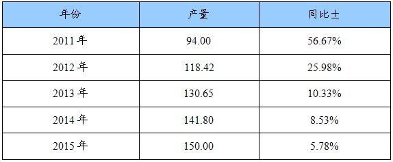 2011-2015年我国甜菜制糖产业规模及增幅预测表