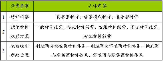 特许经营按特许内容分类包括:商标型特许、经营模式特许、复合型特许。按授予特许权的方式分类包括:一般特许经营、委托特许经营、发展特许经营、复合特许经营、分配特许经营。按供应链中所处位置分类包括:制造商与批发商特许体系,制造商与零售商特许体系,批发商与零售商特许体系,零售商与零售商特许体系。具体如下表: