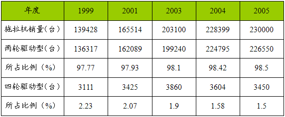 美国是当今世界上最主要的拖拉机生产国,也是世界主要的拖拉机销售国。进入2000年以后,美国每年的农用拖拉机市场销售量却一路攀升,呈现逐年持续增长趋势。在1999~2005年期间,美国的农用轮式拖拉机年销售量保持在14万~23.5万台之间。