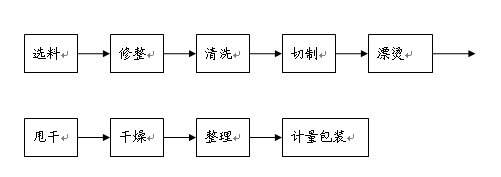 (2)修整:将选好的原料去籽瓤及柄、叶,用清水冲洗后,放在没有太阳直射的地方晾干。由于不同的蔬菜其外表形状、物理特性、化学特性各异,机械完成较困难,因此该工序一般用手工操作。