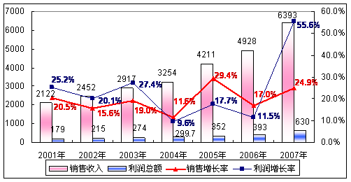 2001-2007年全国医药工业销售收入及利润总额增长状况